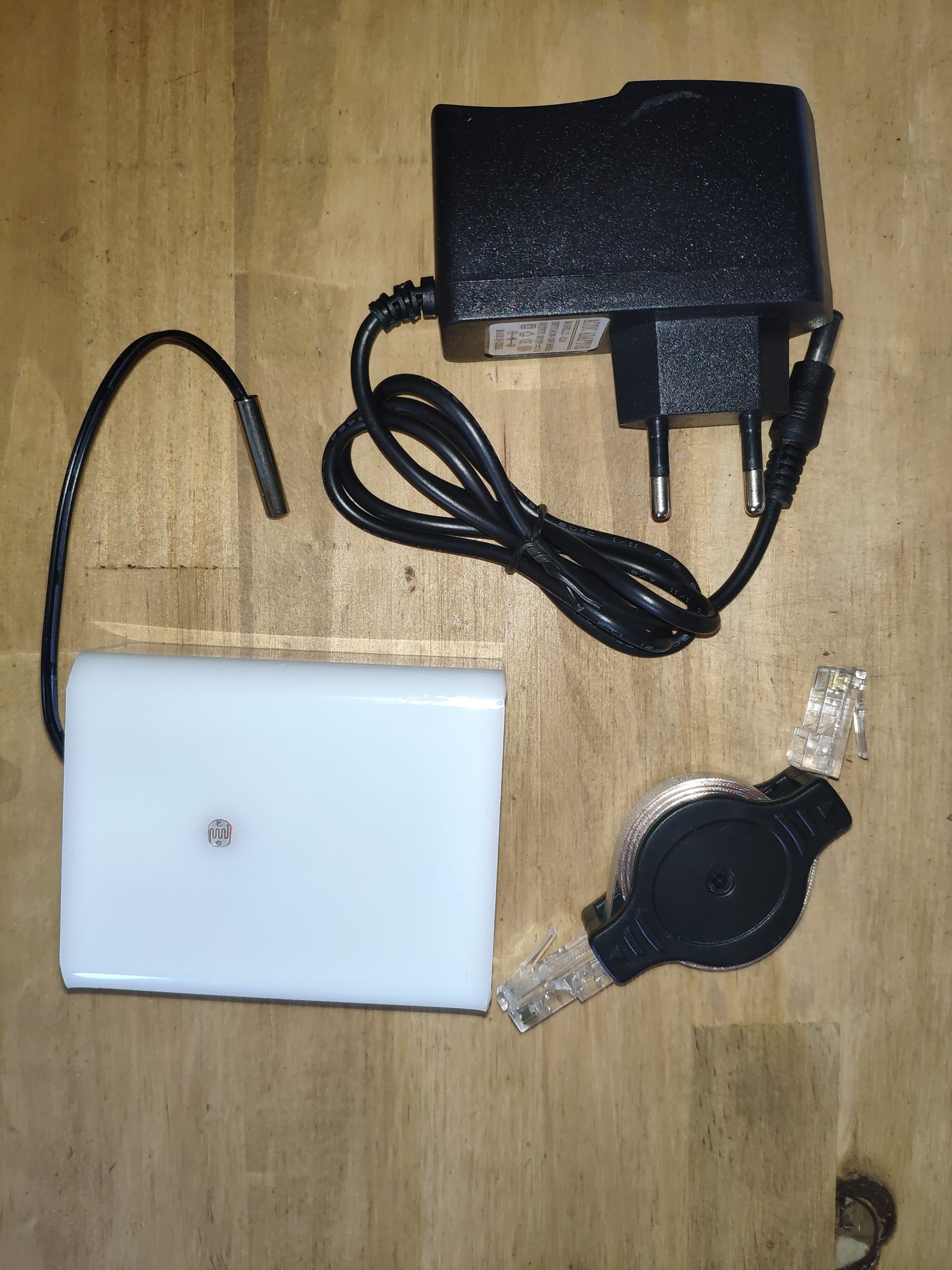 Sur le devant du boitier, on retrouve la prise d’alimentation ainsi que le port RJ45. Un fil sort également pour la sonde de température. Sur le dessus nous pouvons y retrouver un capteur de luminosité. Le boîtier étant sobre, il pourra facilement s’intégrer dans votre installation sans pour autant être visuellement dérangeant.