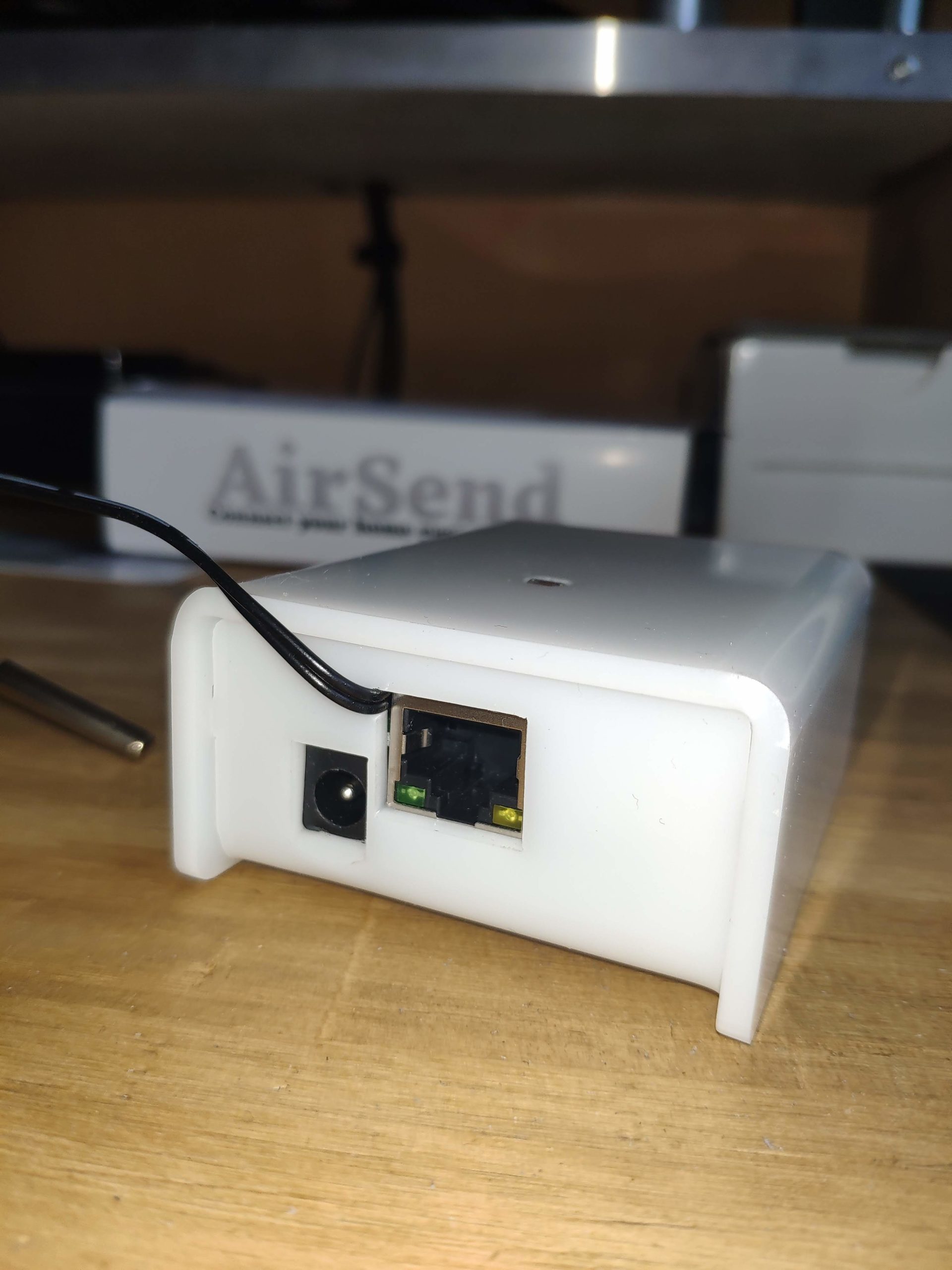 La Boite de L’airSend est assez simple mais complète. Le boitier AirSend, un câble d’alimentation ( 12v 1A ) ainsi qu’un petit câble RJ45 enroulable, celui-ci étant bien pratique, je l’ai gardé de côté pour le mettre dans mon sac de travail !