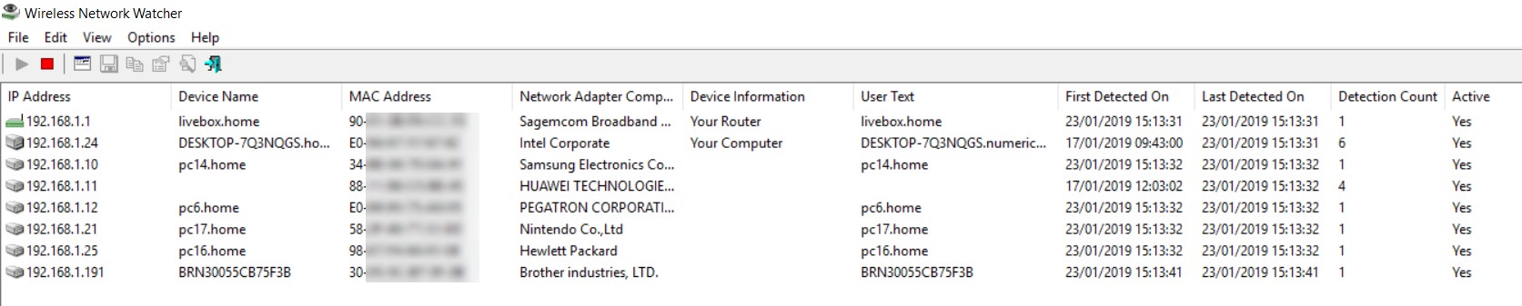 Sur la précédente capture d’écran, vous pouvez observer l’analyse de mon réseau Wi-Fi. On retrouve une liste avec tous les appareils connectés et un certain nombre d’informations sur chacun de ces appareils. Prenons quelques exemples :